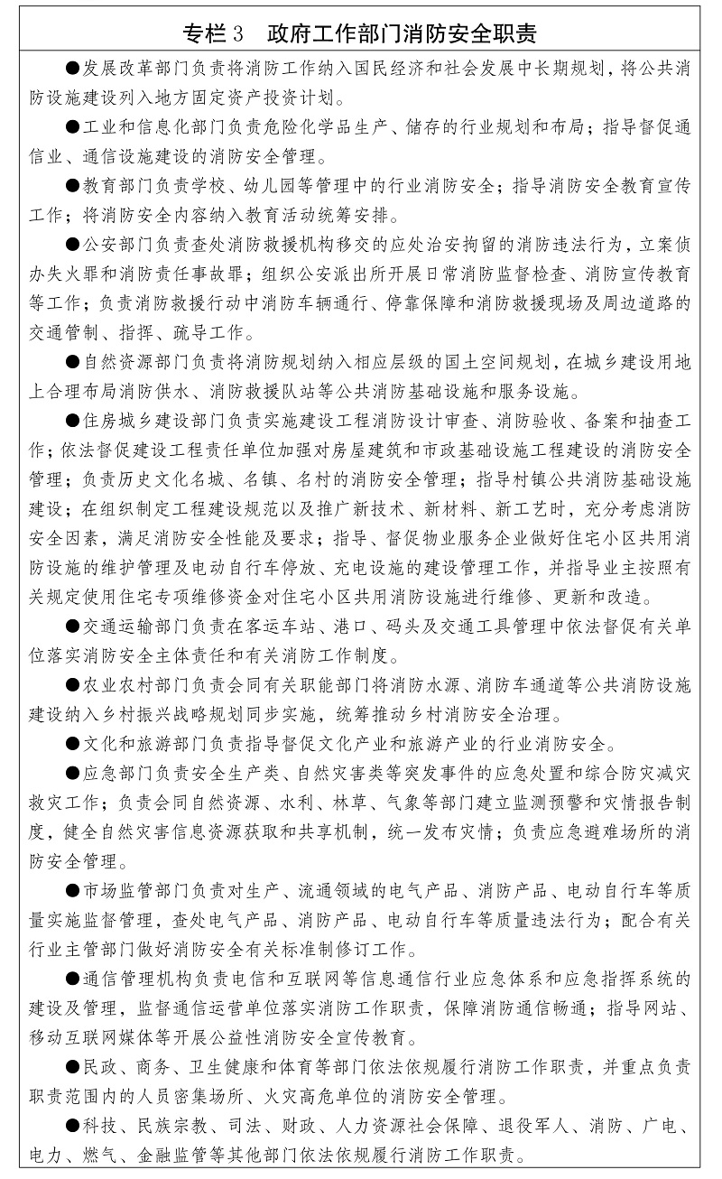 (五)強(qiáng)化政府工作部門消防安全行業(yè)監(jiān)管責(zé)任,落實(shí)“管行業(yè)必須管安全、管業(yè)務(wù)必須管安全、管生產(chǎn)經(jīng)營必須管安全”的要求,堅(jiān)持“誰主管、誰負(fù)責(zé)”,將消防安全與本部門業(yè)務(wù)工作同計(jì)劃、同部署、同總結(jié)、同評(píng)比,納入行業(yè)安全法規(guī)政策、規(guī)劃計(jì)劃、應(yīng)急預(yù)案和日常管理、工作督辦、業(yè)務(wù)檢查、考核評(píng)比等內(nèi)容,作為內(nèi)設(shè)安全監(jiān)管機(jī)構(gòu)職責(zé),實(shí)行行業(yè)消防安全管理標(biāo)準(zhǔn)化建設(shè),對(duì)本行業(yè)、本系統(tǒng)、本部門的消防安全管理全面負(fù)責(zé)。(責(zé)任單位和部門:省消防安全委員會(huì)各成員單位)