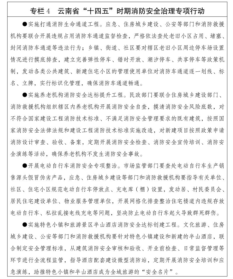 (十五)以推進(jìn)消防安全專項(xiàng)整治三年行動(dòng)為牽引,重點(diǎn)整治高層和地下建筑、大型商業(yè)綜合體、石油化工企業(yè)、農(nóng)村、學(xué)校、醫(yī)院、社會(huì)福利機(jī)構(gòu)和“三合一、多合一”場(chǎng)所、老舊小區(qū)、易地扶貧搬遷安置點(diǎn)等高風(fēng)險(xiǎn)對(duì)象,以及消防車通道、電氣消防安全、電動(dòng)自行車等領(lǐng)域突出問題,完善全域旅游配套產(chǎn)業(yè)消防安全監(jiān)管措施,實(shí)時(shí)跟進(jìn)光伏板、巨型水電站及配套儲(chǔ)能設(shè)施、半山酒店等新材料新能源新業(yè)態(tài)存在的消防安全風(fēng)險(xiǎn),逐步整治和消除靜態(tài)火災(zāi)隱患(詳細(xì)任務(wù)見第七節(jié)“重大項(xiàng)目”項(xiàng)目一)。(責(zé)任單位和部門:各州、市人民政府;省消防救援總隊(duì),省應(yīng)急廳、省住房城鄉(xiāng)建設(shè)廳、省文化和旅游廳、省教育廳、省民政廳、省農(nóng)業(yè)農(nóng)村廳、省水利廳、省衛(wèi)生健康委)