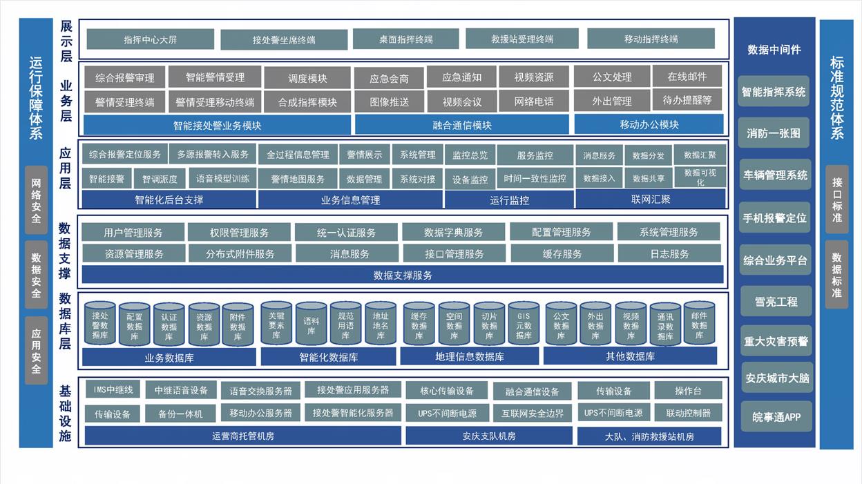 安慶市消防救援支隊智能接處警系統(tǒng)架構(gòu)采用“6+2+1”模式,即6個功能層級、兩個體系、1個數(shù)據(jù)中間件平臺。6個層級主要包括基礎(chǔ)設(shè)施、數(shù)據(jù)庫層、數(shù)據(jù)支撐、應(yīng)用層、業(yè)務(wù)層和展示層六個部分組成。