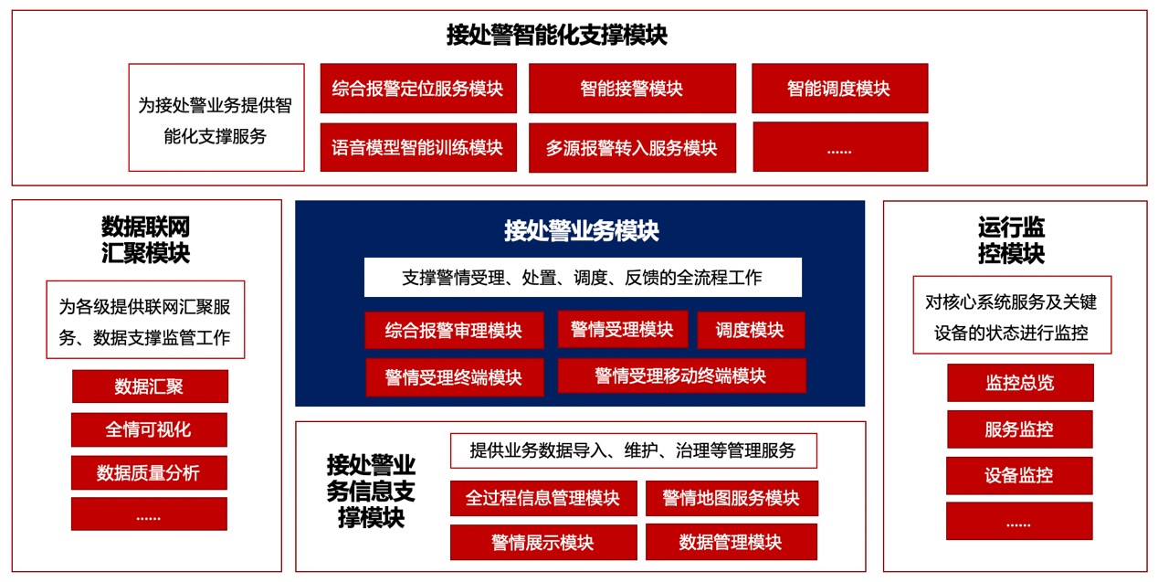綜合考慮接處警業(yè)務(wù)的實際工作需求,智能接處警系統(tǒng)由接處警業(yè)務(wù)、智能化后臺支撐、接處警業(yè)務(wù)信息支撐、聯(lián)網(wǎng)匯聚、運行監(jiān)控五部分組成,具體模塊建設(shè)內(nèi)容如下: