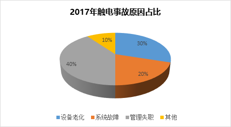 從2012年至2017年觸電事故率頻繁上升,目前已經(jīng)成為工地極為重視的安全問題之一。觸電事故除了會造成人員傷亡,同時還會造成連帶事故,包括:火災(zāi)、爆炸等。根據(jù)統(tǒng)計,造成觸電事故的原因主要包括:設(shè)備老化,高壓系統(tǒng)故障,現(xiàn)場管理失職(非專業(yè)人員私自開啟電箱、電箱未采用保護措施)等,占比如下圖所示: